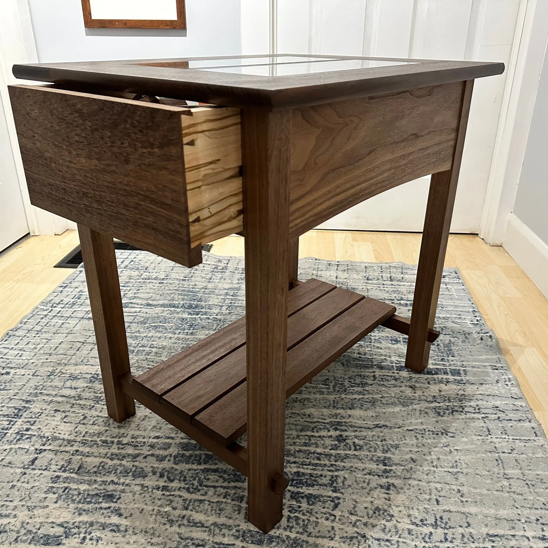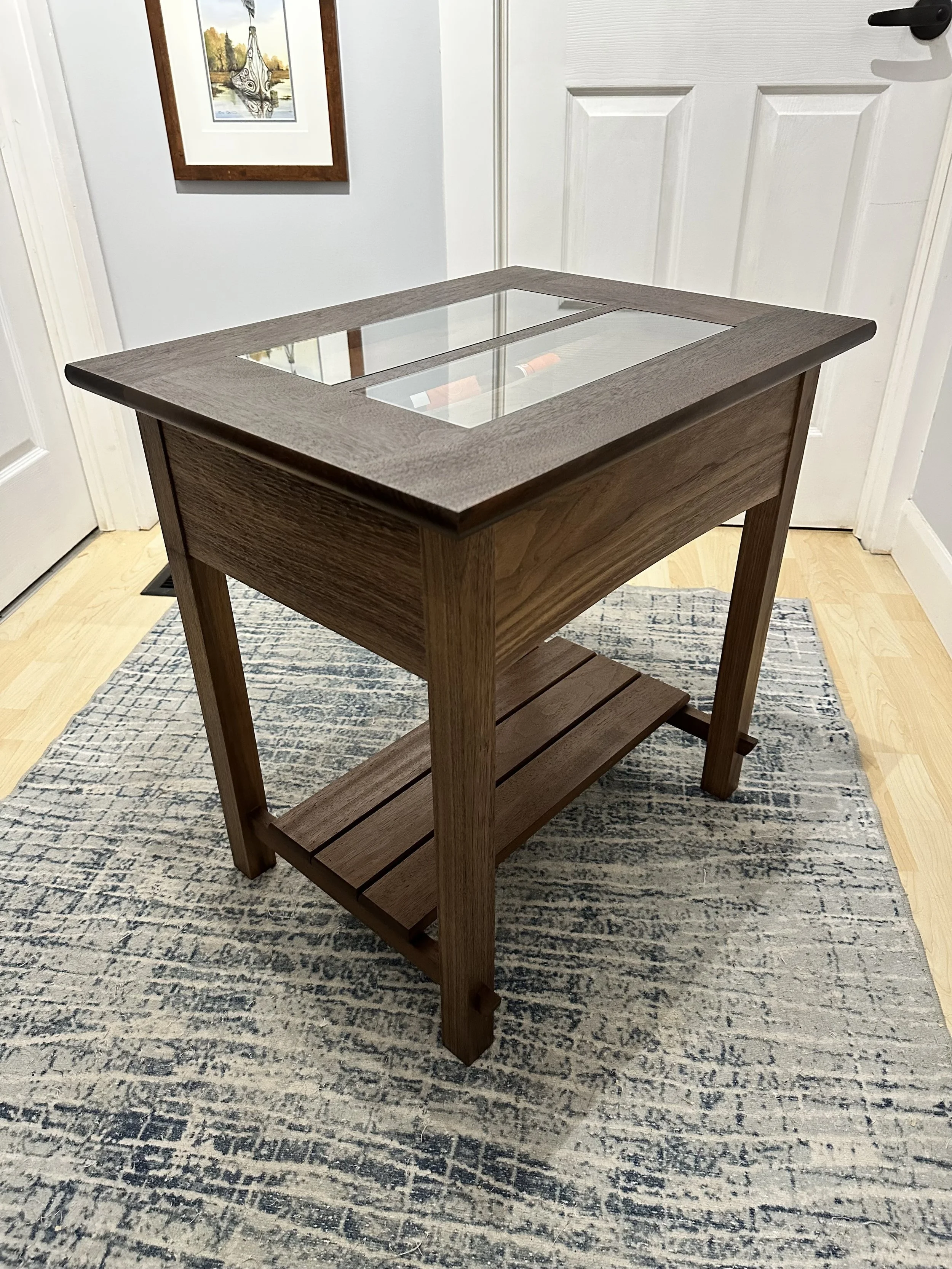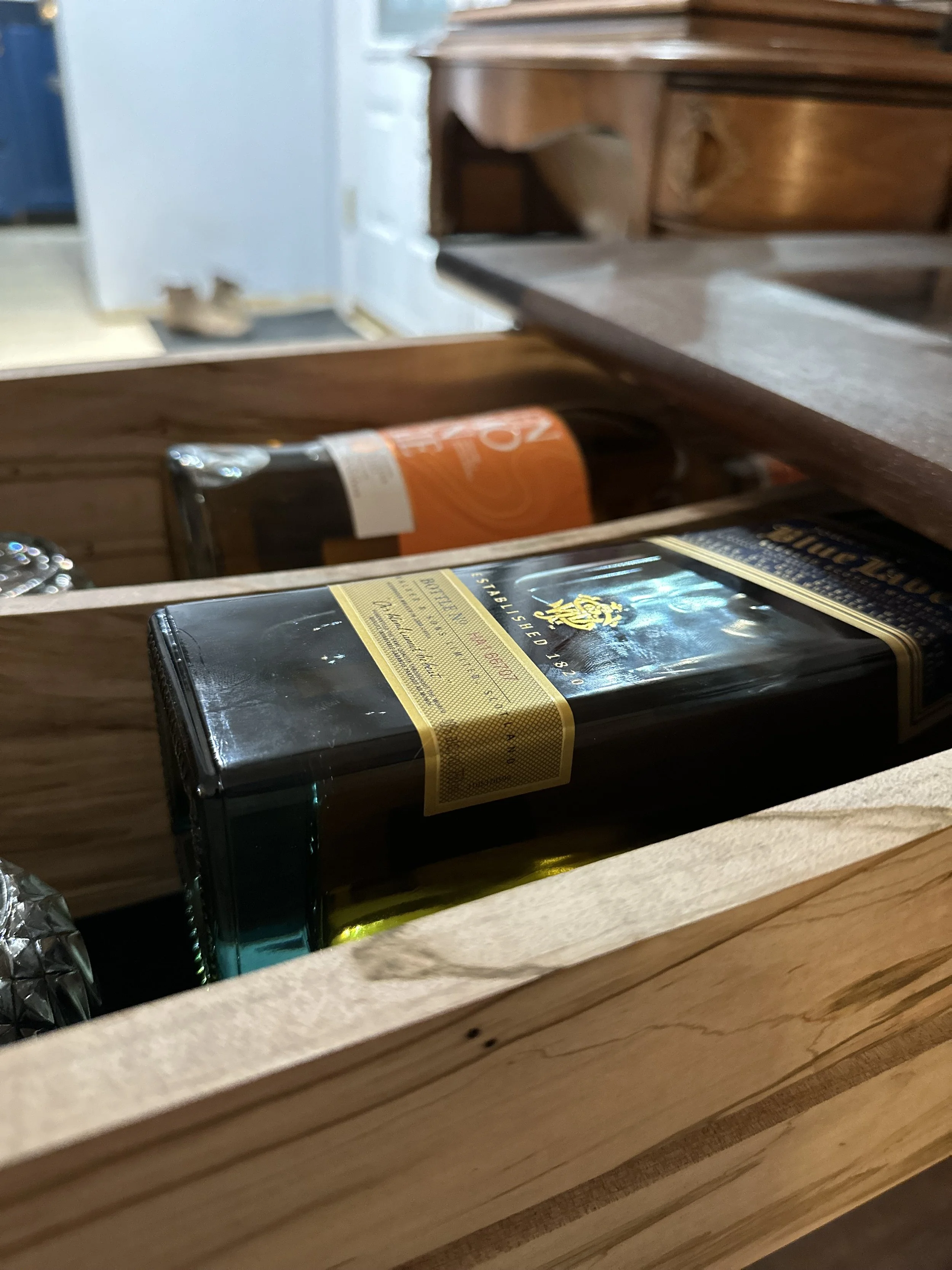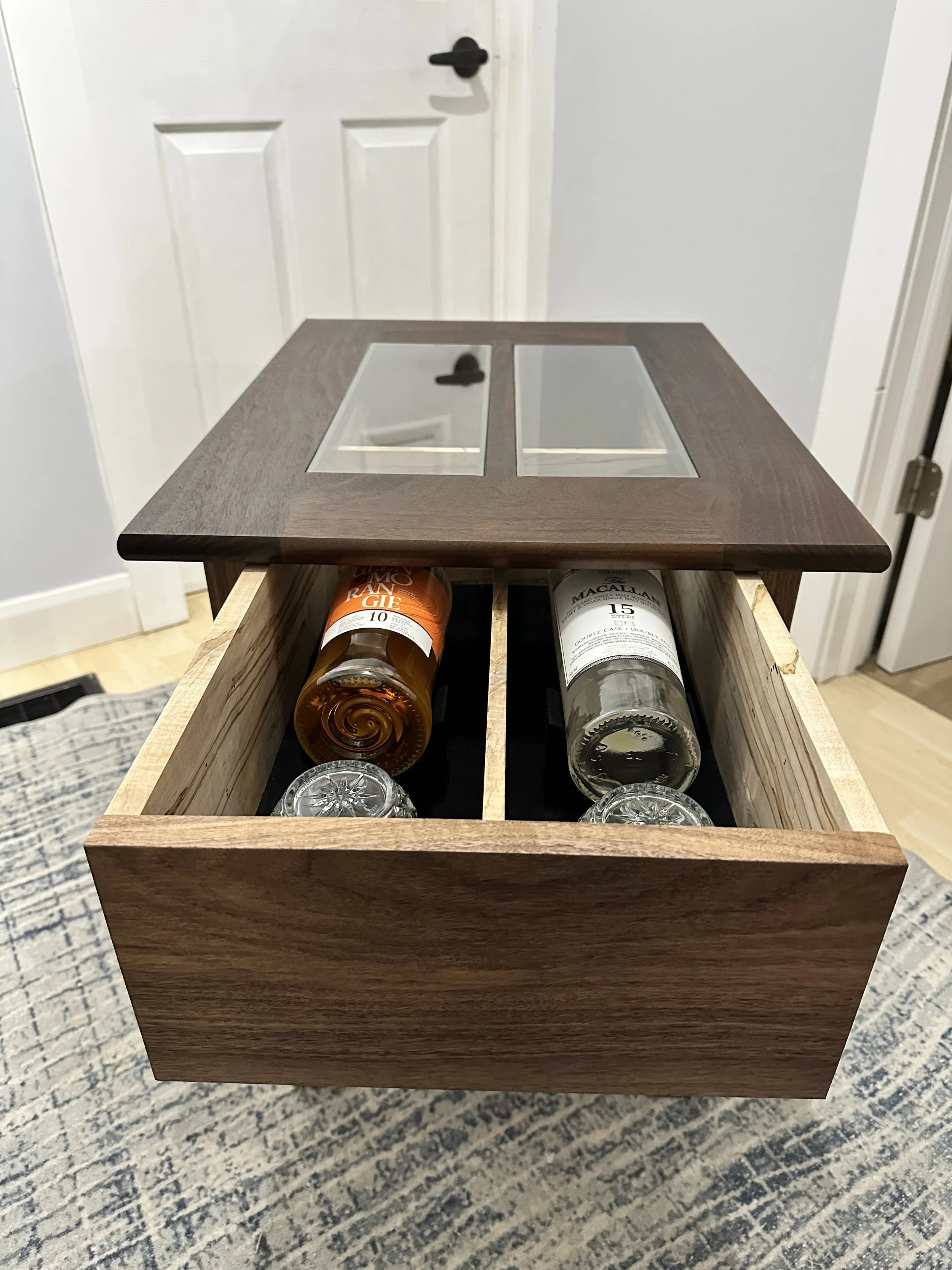 Peruvian Walnut and American Black Walnut construction - accented by a stunning Ambrosia Maple drawer. Designed to hold two of your favourite bottles of scotch or whisky. The inset glass allows a showcase of your collection.